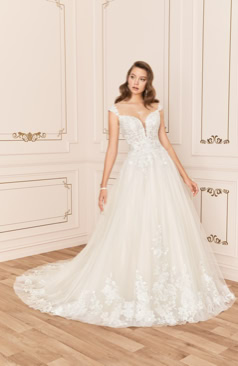 Ein wunderschönes A- Linien Brautkleid aus Tüll und Glitzertüll. Das Kleid wird durch florale Spitze verziert die sich im Oberteil und im unteren Bereich des Rockes und der Schleppe wiederfinden. Das Kleid ist mit einem tiefen Ausschnitt und Trägern aus Spitze gearbeitet.
