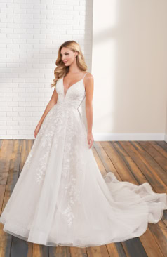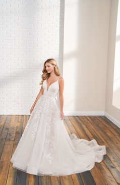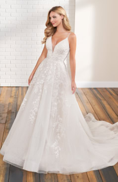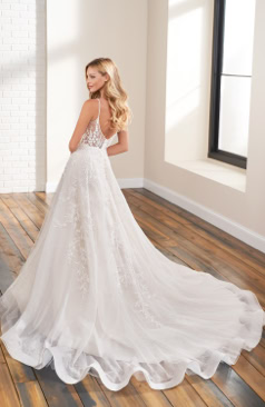Das hier zusehende Brautkleid ist eine klassische und moderne Schönheit. Die A-Linie wird durch Spaghetti-Träger, einen verführerischen abgerundeten V-Ausschnitt, einen illusionsspitzen-Rücken und einer langen fantastischen Schleppe vervollständigt. Die Spitzenapplikationen die sanft an dem Brautkleid hinunter laufen, sind zusätzlich mit handbestickten Perlen sowie glitzernden Mustern bestickt. Eine wundervolle Kombination aus Tüll und Spitze. Geschlossen sowie geöffnet wird das Kleid mit einem Reißverschluss im Bereich des illusionsspitzen-Rücken.