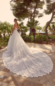 Die unglaublich lange und wunderschöne Schleppe sorgt für einen majestätischen Auftritt und lässt dich wie eine Prinzessin fühlen. Zahlreiche Applikationen schmücken das Kleid und verleihen ihm einen Hauch von Eleganz und Raffinesse. Der Spitzenabschluss am Rock und der Schleppe setzt glamouröse Akzente und unterstreicht die detailverliebte Handwerkskunst, die in dieses Kleid geflossen ist.