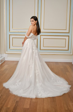 Zauberhaftes Brautkleid mit zarten Off-Shoulder-Trägern, das pure Romantik versprüht. Die weichen Spitzenärmel umschmeicheln deine Schultern und lassen den Herzausschnitt besonders elegant wirken. Das fein bestickte Oberteil geht fließend in einen luftigen Tüllrock über, der mit sanften Spitzenapplikationen verziert ist und bei jeder Bewegung traumhaft mitschwingt. Dieses A-Linien-Brautkleid ist die perfekte Wahl für Bräute, die einen femininen, leicht verspielten Look lieben – ob im Rosengarten, auf dem Landgut oder bei einer freien Trauung. Die zarten 3D-Blüten und die sanfte Schleppe runden den märchenhaften Stil ab.