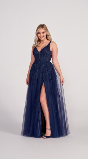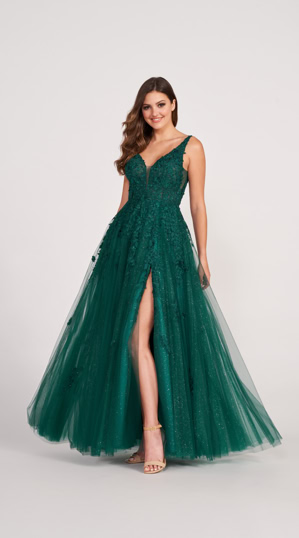 Dieses Abendkleid besticht durch seine elegante Kombination aus floraler Spitze mit 3D-Akzenten, einem verführerischen V-Ausschnitt und einem tiefen Rückenausschnitt. Der ausgestellte Tüllrock verleiht dem Kleid eine luftige Leichtigkeit, während ein Beinschlitz für zusätzliche Raffinesse sorgt. Ideal für einen glamourösen Auftritt bei besonderen Anlässen.