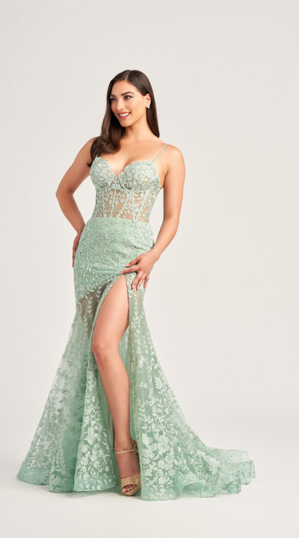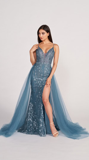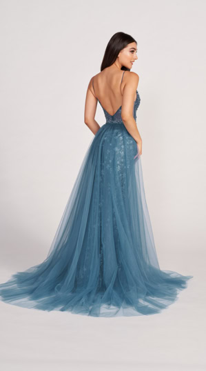 Das Abendkleid ist halbtransparent aus Spitze und Tüll gefertigt mit einen verführerischen Beinschlitz, Glitzerverzierungen und zarten Trägern, die in einem atemberaubenden Rückenausschnitt verlaufen. Ein besonderes Abendkleid für einen besonderen Anlass.