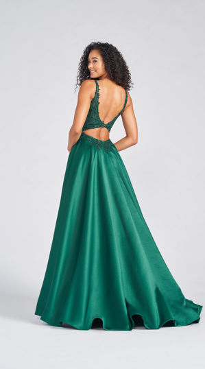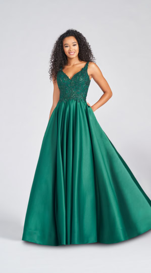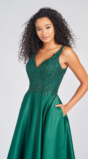 Eine bezaubernde A-Linie aus Satin und modernen Spitzenapplikationen. Das wundervolle Abendkleid hat einen verführerischen V- Ausschnitt und Spitzenträger. Die Spitzenapplikationen die sich hauptsächlich im Bereich des Oberteils befinden, laufen sanft an der Taille aus und der wundervolle Rückenausschnitt sowie die eingearbeiteten Taschen sind ein weiteres Highlight des Kleides. Die A-Linie wird unterhalb des tiefen V- Rückens mit einem Reißverschluss geschlossen.
