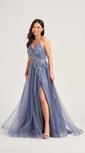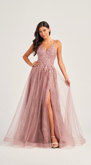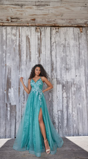 Ein wunderschönes Abendkleid im A-Linien Stil. Zusehen ist ein herzförmiges Oberteil mit einem eleganten Ausschnitt, zarte Spitzen-Spaghettiträger und einen verführerischen Beinschlitz.