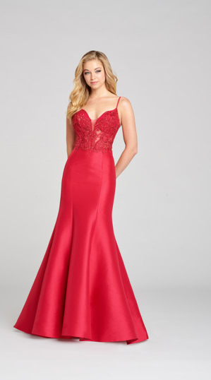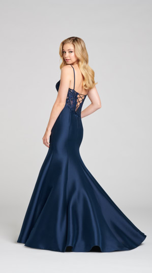Stretch- Mikado Trompetenkleid. Das Abendkleid ist mit einem tiefen Ausschnitt gearbeitet. Zugleich hat das Trompetenkleid eine Schnürung im Rückenbereich und einen Rosshaarsaum sowie eine Sweep- Schleppe, die das Kleid noch besonderer machen. Außerdem ist das Abendkleid mit eleganten Spitzenapplikationen verziert und mit dezenten Steinakzenten bestickt.