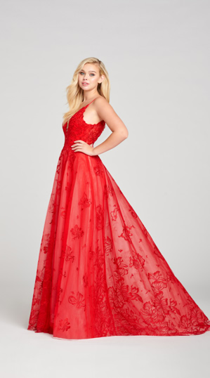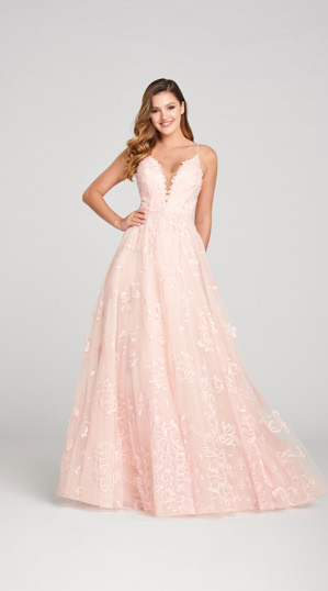 Ein wunderschönes Tüll-Ballkleid, mit einem geraden trägerlosen Ausschnitt. Das Oberteil der A- Linie ist mit vielseitigen Spitzenapplikationen ausgearbeitet, sowie mit Glitzer und Pailletten bestickt. Die Spitze verläuft in den Rock des Kleides.