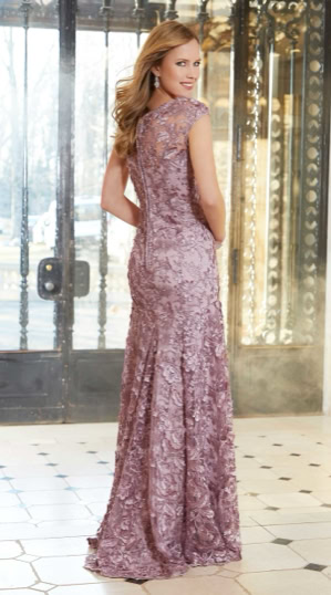 Im Bereich des Oberteils befinden sich handbestickte Spitzenapplikationen, die an dem Abendkleid sanft hinunter laufen. Der leichte und weiche Soft-Tüll der A-Linie vermittelt eine besondere Leichtigkeit des Kleides. Geschlossen wird das Abendkleid mit einem Reißverschluss im Bereich des Rückens.
