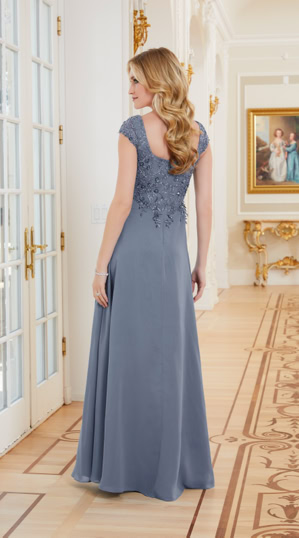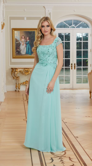 Dieses schöne Abendkleid verfügt über einen schicken quadratischen Ausschnitt und durchsichtigen kurzen Ärmeln auf einem Mieder, das mit zarten Kristallperlen und Blumenapplikationen bestickt ist. Der drapierte Chiffon-A-Linien-Rock verleiht Ihnen eine schmeichelhafte Passform.