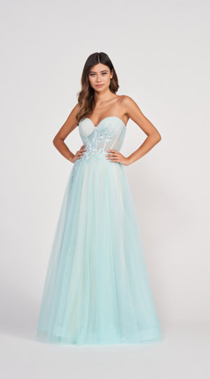 Eine zarte Schönheit mit einem Hauch vom modernen Lingerie Stil. Dieses himmlische Abendkleid strahlt mit seiner funkelnden aber schlichten Schönheit. Die Besonderheit dieser A-Linie ist das fantastische Farbspiel in dem Tüllrock. Außerdem besitzt das trägerlose Abendkleid einen herzförmigen Ausschnitt, eine halbtransparente Korsage, einen offenen Rückenausschnitt sowie zauberhafte Spitzenverzierungen, die asymmetrisch im Bereich des Oberteils gekonnt in Szene gesetzt sind.