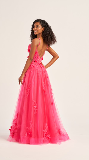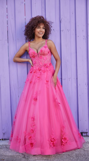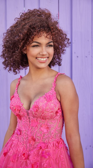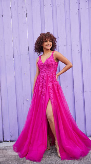 Ein funkelndes märchenhaftes Abendkleid. Zarte Träger, elegante Spitzenapplikationen mit 3D Blumendetails, eine fantastische Korsage, ein verführerischer Beinschlitz, ein wundervoller Rückenausschnitt, seitliche Taschen im Bereich der Hüfte und eine dezente Schleppe umrahmen die A-Linie in voller Pracht. Dieses Kleid ist ein absoluter Hingucker.