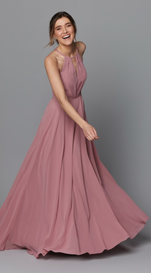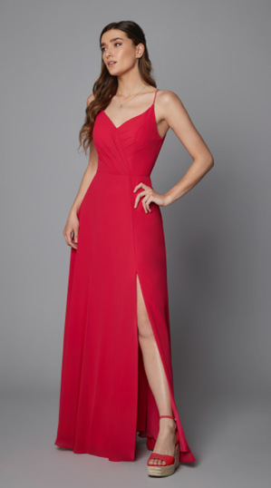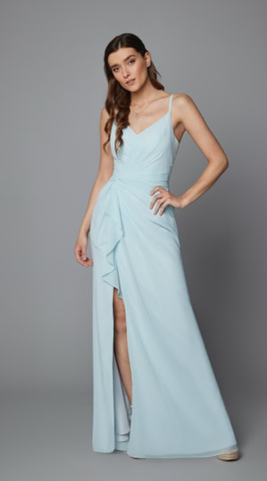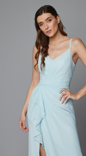 Zartes Chiffon-Abendkleid mit drapiertem Oberteil mit hohem Neckholder und Criss-Cross-Back. Ein fließender A-Linienrock mit Seitenschlitz. Perfekt für Trauzeuginnen und Brautjungfern. Lieferbar in vielen weiteren wundervollen Farben.