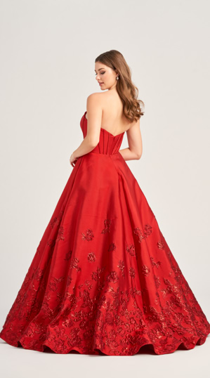 Ein moderne, elegante und trägerlose Korsage schaffen einen bezaubernden Rahmen für Ihr Dekolleté und Schultern. Durch die eng anliegende Korsage und den ausgestellten Rock wird die Taille besonders betont. Das gesamte Ball- Abendkleid ist aus einem hochwertigen Brokat gefertigt und verziert mit Blumenmotiven im unteren Bereich des ausgestellten Rocks.