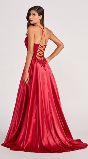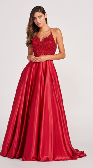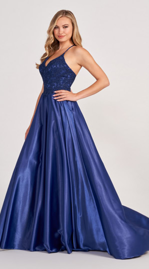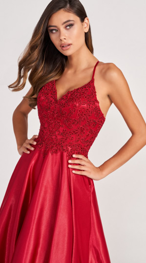 Schlichte Eleganz trifft hier auf verspielte Details. Dieses bezaubernde Abendkleid im A-Linien Stil besitzt einen reizenden V-Ausschnitt, feine Spaghettiträger, eine mit Spitze bestickte Korsage und einen himmlischen Satinrock. Die Besonderheit und vor allem der absolute Blickfang des Kleides ist der verspielte Rückenausschnitt mit der perfekt in Szene gesetzten Schnürung. Einfach nur wunderschön dieses Abendkleid!