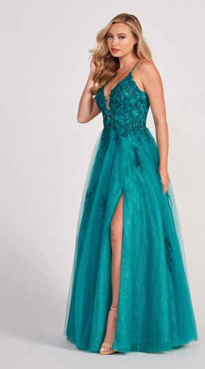 Ein wunderschönes Abendkleid mit einem verführerischen V-Ausschnitt, zarten Spaghettiträgern, einen sexy Beinschlitz, glamouröse Spitzenapplikationen im Bereich des Oberteils sowie auch unterhalb der Tüllschicht und einer fantastischen Schnürung im Rückenbereich. Wirklich ein wundervolles Abendkleid im A-Linien Stil.