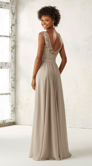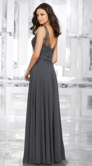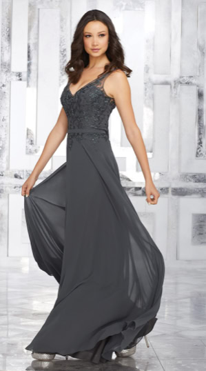 Ein wundervolles Abendkleid aus einer perfekten Kombination zwischen modernen Spitzenapplikationen und luftig-leichten Chiffon. Das Oberteil wird durch die Illusionsspitze und dem leicht verdeckten Herzausschnitt hervorgehoben. Die Silhouette der Frau wird in diesem Abendkleid durch den fixierten Taillengürtel wunderbar betont und kommt somit deutlich zum Vorscheinen. Auch der Rückenausschnitt ist in diesem Kleid perfekt in Szene gesetzt.