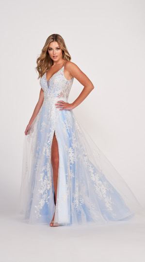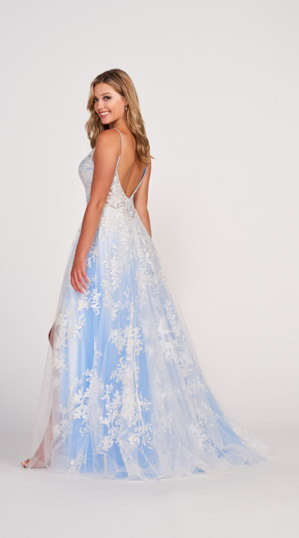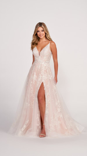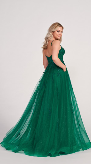 Zusehen ist hier ein romantisches Abendkleid aus einer wundervollen Glitzer-Spitzenverzierung und Tüll Kombination. Der sexy Beinschlitz, die zarten Spaghettiträger, die halbtransparente Korsage, der elegante V-Ausschnitt sowie der reizende Rückenausschnitt und die seitlichen Taschen im Bereich des Rockes vervollständigen dieses bezaubernden Kleides.