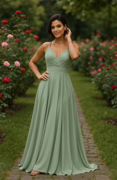 Dieses romantische Abendkleid in der Trendfarbe Sage begeistert mit schlichter Eleganz und zarter Leichtigkeit. Das figurbetonte Oberteil mit überkreuztem V-Ausschnitt zaubert eine feminine Silhouette, während die feinen Spaghettiträger für einen modernen, eleganten Look sorgen.