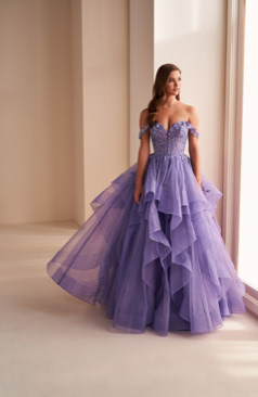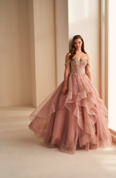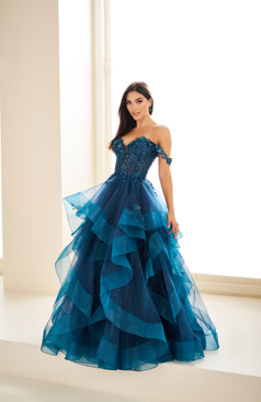 Dieses Abendkleid ist ein echtes Statement und kombiniert ein tiefes, dekoratives Corsagenoberteil mit abnehmbaren, verspielt wirkenden Off-Shoulder-Elementen. Die bestickten Applikationen sorgen für Struktur und einen festlichen Look. Der mehrlagige Volantrock aus glitzerndem Tüll verleiht dem Kleid beeindruckendes Volumen und eine dramatische, fließende Silhouette – ideal für große Auftritte wie Abibälle, Galas oder festliche Abendevents.