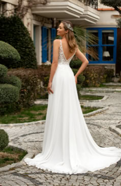 Grandiose florale Spitzenverzierungen im gesamten Oberteil, ein reizender Ausschnitt, zarte Träger, ein passender fixierter Taillengürtel für die perfekte Silhouette sowie auch der offene und somit hinreißende V-Rücken umrahmen diese Schönheit. Geschlossen wird das Brautkleid mit einem Reißverschluss unterhalb der Rückenpartie.