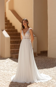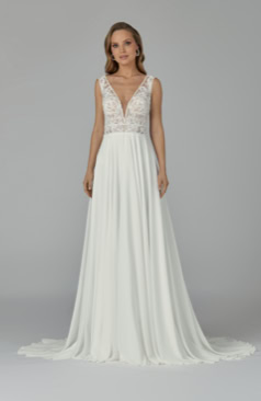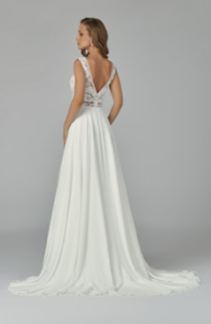 Traumhaft! Das hier zusehende eindrucksvolle Brautkleid besitzt einen reizvollen V-Ausschnitt, glamouröse Spitzenapplikationen im gesamten Bereich des Oberteils, wundervolle Illusionsspitzen-Träger, die in einen bezaubernden Rückenausschnitt hinüber laufen und einen himmlischen Chiffonrock mit einer romantischen Hofschleppe. Geschlossen wird dieses Brautkleid mit einem Reißverschluss unterhalb des V-Rückens.